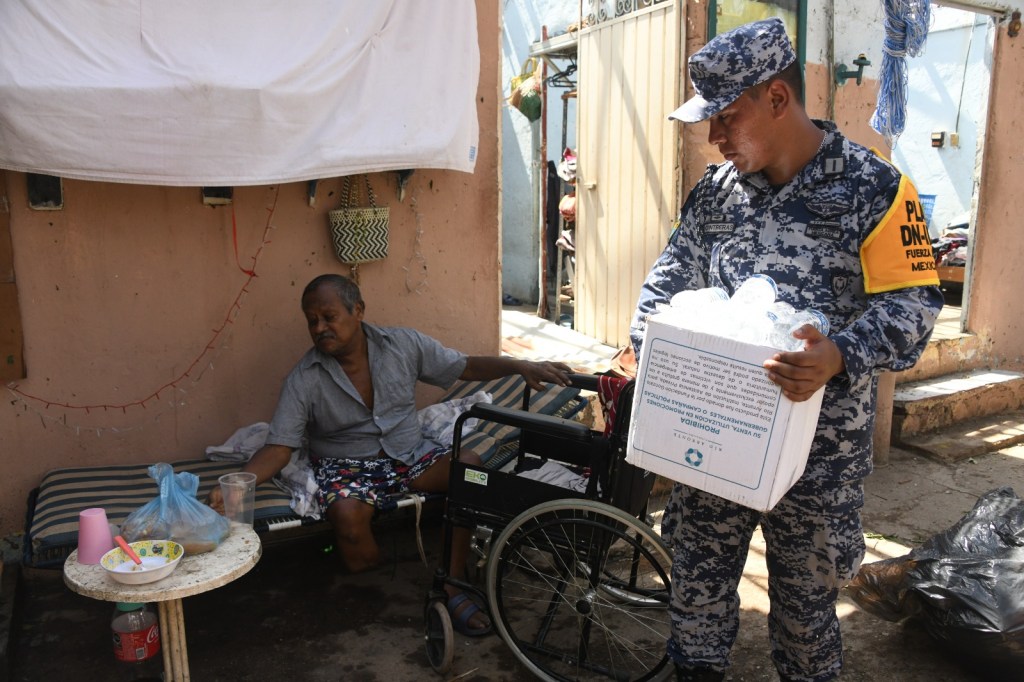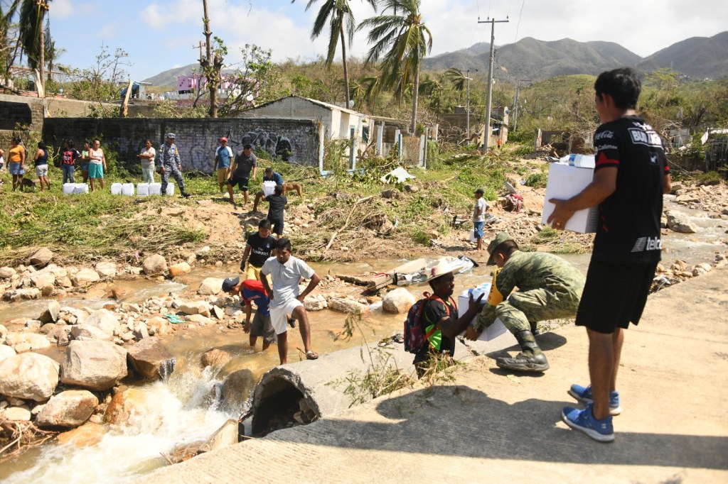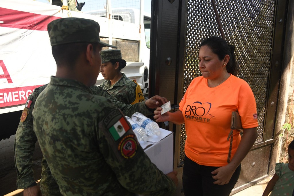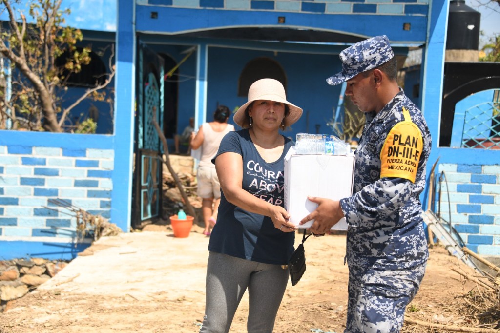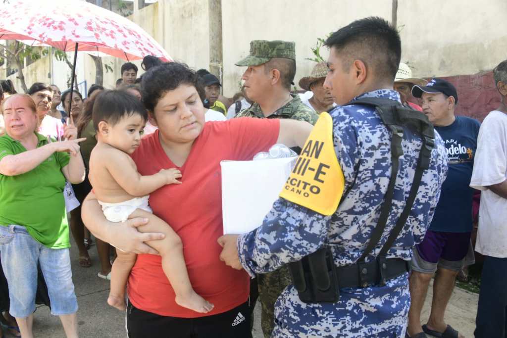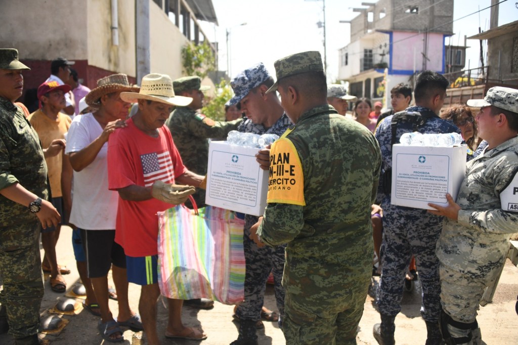 El personal de la Secretaría de la Defensa Nacional (Sedena), de la Secretaría de Marina (Semar) y de la Guardia Nacional (GN), desplegado en Acapulco, Guerrero, distribuyen despensas entre la población afectada por el paso del huracán «Otis».