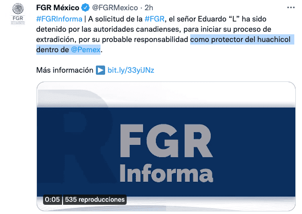 De acuerdo con comunicado, Eduardo “L” fue judicializado por la FGR en 2019, acusado de «probablemente ser responsable como el protector del huachicol dentro de PEMEX, ya que se pudo comprobar que él y un grupo de cómplices, también ya procesados, presuntamente encubrieron y protegieron el huachicol en las redes de distribución de PEMEX.»
