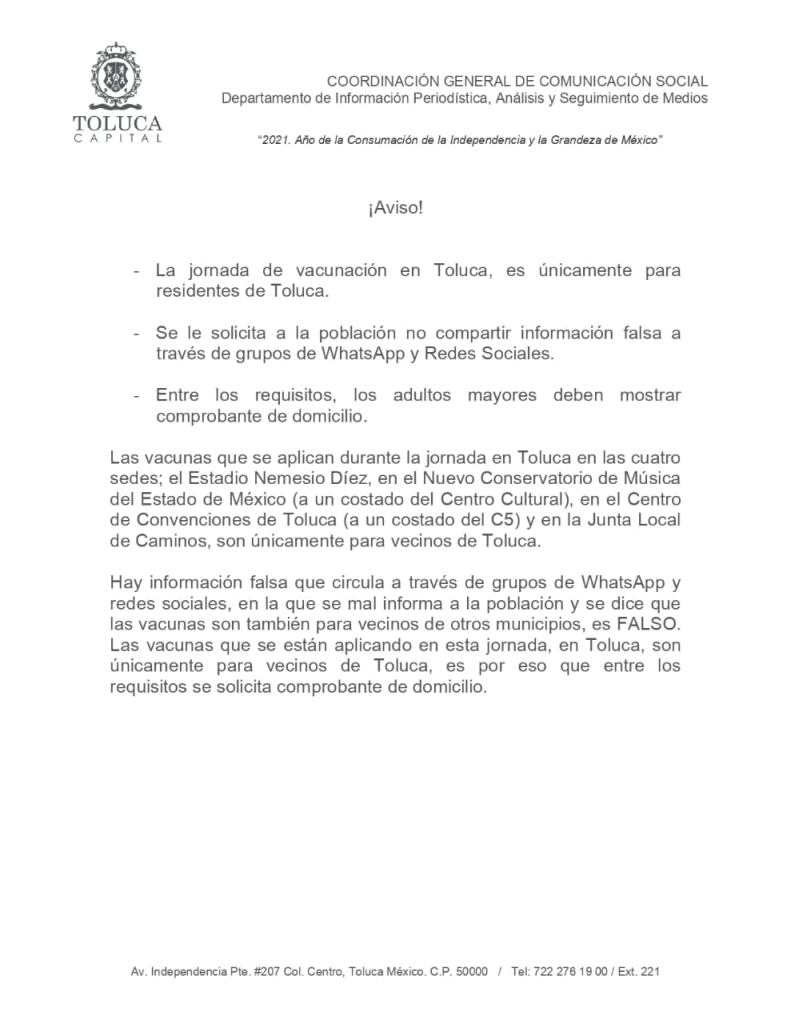 A través de redes sociales y WhatsApp circula información en la que se menciona que en Toluca se vacunará a habitantes de otros municipios, la cual fue desmentida por las autoridades estatales. y municipales.