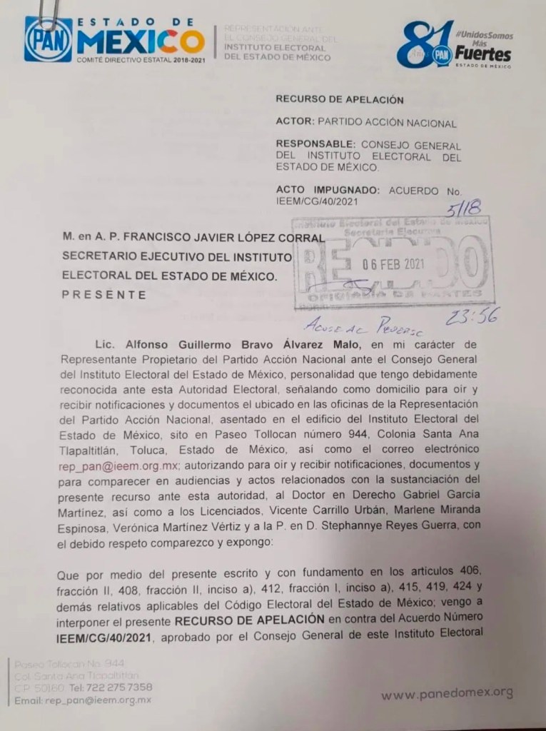 Este sábado el Movimiento de Regeneración Nacional (Morena) presentó un recurso de apelación en contra de la coalición PRI-PAN-PRD para la elección de diputados y miembros de los ayuntamientos ante el Instituto Electoral del Estado de México (IEEM), llamada “Va por el Estado de México”.