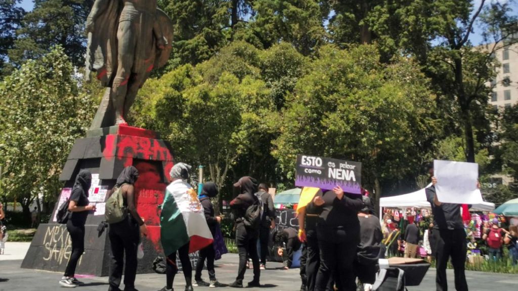 Ahí colocaron una serie de pintas y carteles, en espera de que llegaran más personas. “México Sangra”, “No estás sola”, “Ni perdón ni olvido”, “Luchar hasta que la dignidad se haga costumbre”, eran las frases que se leían en la base de piedra del monumento a Cuauhtémoc.