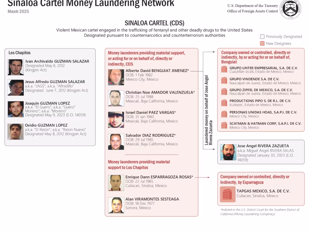 El pasado 31 de marzo, la Oficina de Control de Activos Extranjeros (OFAC) sancionó a seis mexicanos, entre ellos Alberto David Benguiat Jiménez, a quien señalan como operador de una red que mueve ganancias del narcotráfico desde Estados Unidos hacia México. La red, según el gobierno estadounidense, habría blanqueado más de 50 millones de dólares para José Ángel Rivera Zazueta, alias El Flaco, uno de los principales traficantes de fentanilo del cártel.
