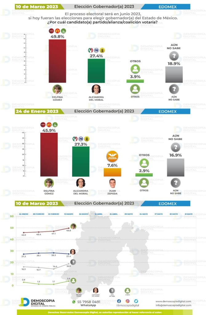 En cambio, la encuestadora Demoscopia Digital señaló que Defina Gómez amplió su ventaja 4 puntos sobre Alejandra del Moral en 6 semanas.