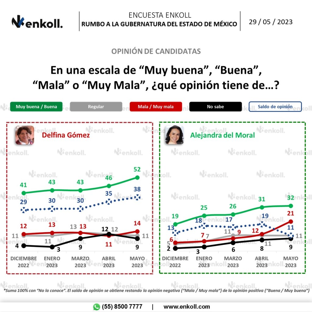 En cuanto a la opinión que tiene la ciudadanía sobre ambas candidatas, Delfina Gómez obtuvo 52% de opiniones positivas y 14% negativas. Por su parte, Alejandra del Moral recibió 32% de opiniones positivas y 21% de negativas («mala» a «muy mala»).