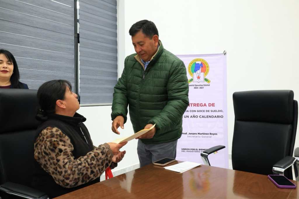 Como parte del cumplimiento del Convenio de Sueldo y Prestaciones vigente entre el Gobierno del Estado de México y el Sindicato de Maestros al Servicio del Estado de México (SMSEM), el Secretario General, Jenaro Martínez Reyes, encabezó la entrega de Licencias con Goce de Sueldo por un Año Calendario y Licencias improrrogables hasta por seis meses por enfermedad no profesional y de prolongada recuperación.