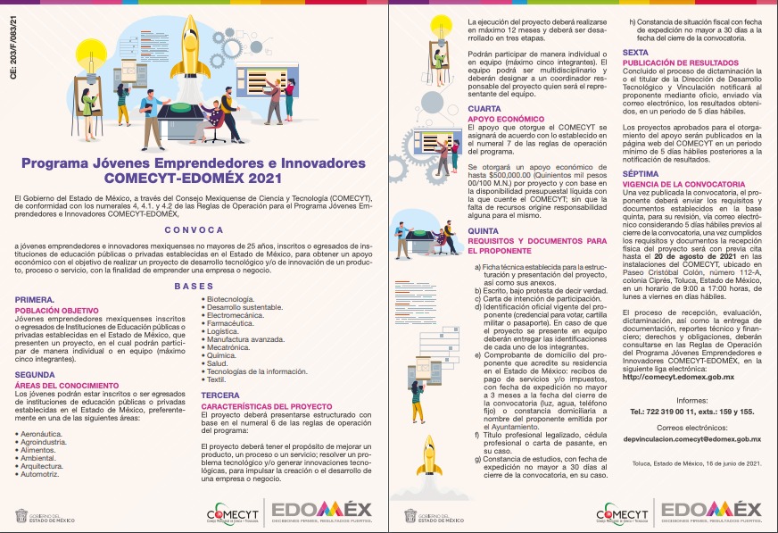 La Secretarías de Educación y de Desarrollo Económico, el Consejo Mexiquense de Ciencia y Tecnología (Comecyt) y el Instituto Mexiquense del Emprendedor (IME) emitieron una convocatoria para apoyar a jóvenes emprendedores con recursos económicos de hasta 500 mil pesos.