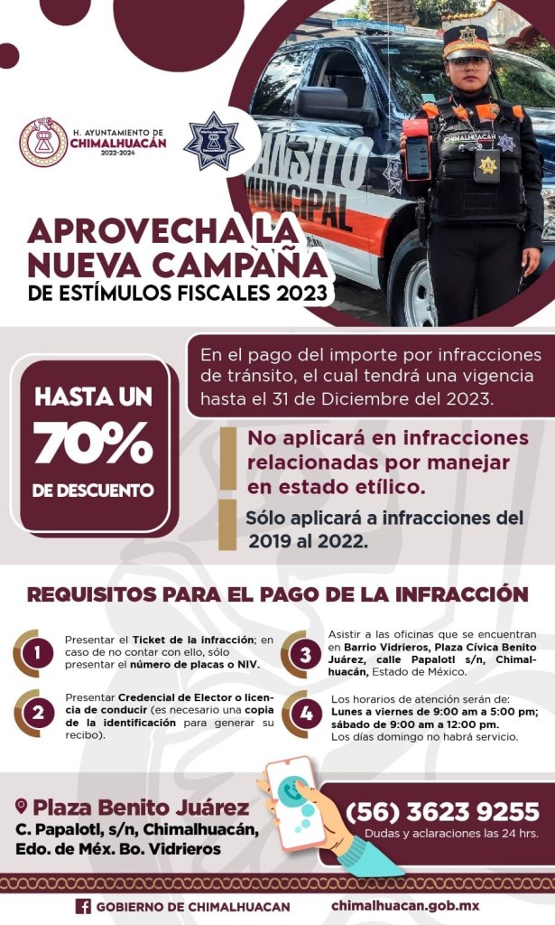 La Dirección de Tránsito de Chimalhuacán, Estado de México, anunció la Campaña de Estímulos Fiscales 2023, brindando una oportunidad única para acceder a descuentos en el pago de infracciones de tránsito ocurridas entre los años 2019 y 2022.
