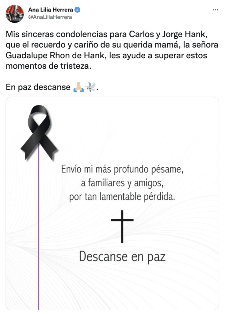Guadalupe Rhon de Hank falleció a los 96 años de edad. Su funeral se lleva a cabo en el rancho «Don Catarino», en Santiago Tianguistenco, Estado de México.