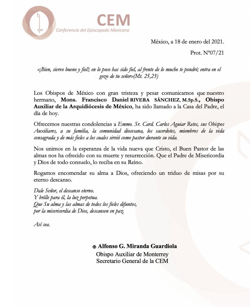 En su cuenta de Twitter, el CEM escribió “ofrecemos nuestra oración por el eterno descanso de nuestro hermano Mons. Francisco Daniel Rivera Sánchez, obispo auxiliar de la Arquidiócesis Mexicana. Que sea recibido en la casa eterna como fiel servidor del Señor. La Santísima Virgen lo acompañe”.