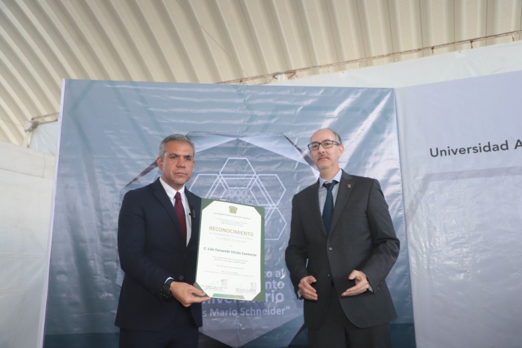 En reconocimiento a las obras realizadas por el gobierno de Ecatepec para el fortalecimiento a la infraestructura educativa en la Universidad Autónoma del Estado de México (UAEMex), autoridades de la casa de estudios otorgaron el reconocimiento al Fortalecimiento Universitario “Luis Mario Schneider” al presidente municipal de Ecatepec, Fernando Vilchis Contreras.