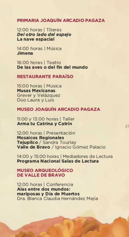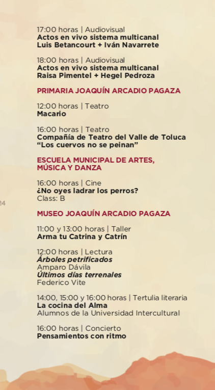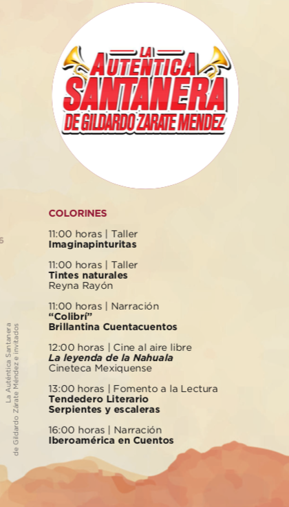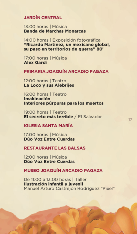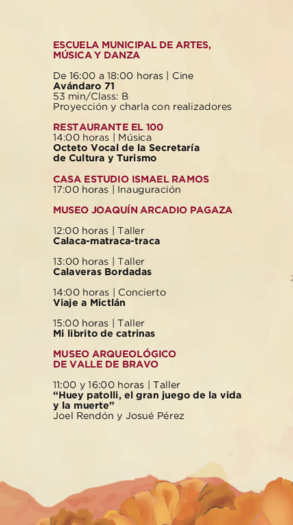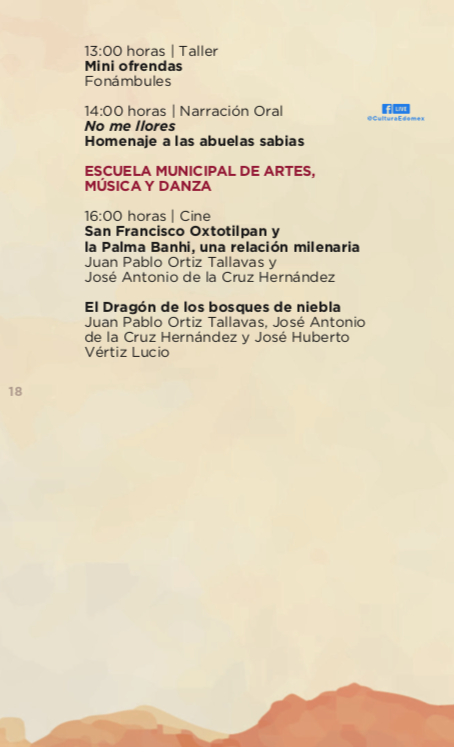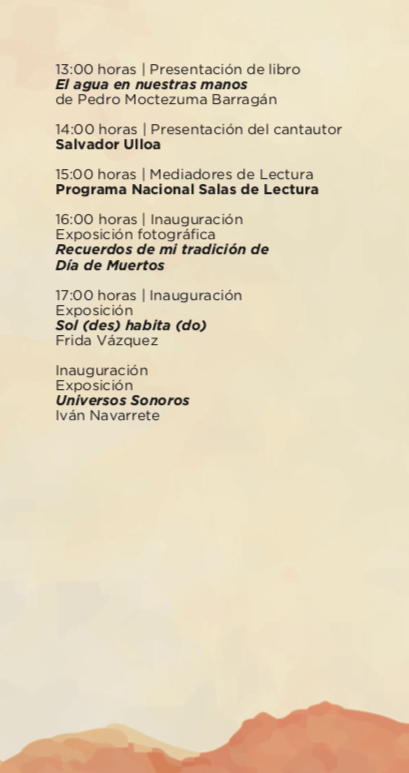 Los niños participarán en las narraciones de cuentos y en actividades que buscan fomentar el hábito de la lectura como los cuentacuentos y las tertulias literarias. Habrá talleres de tintes naturales, proyecciones cinematográficas como las que abordan las leyendas y cortometrajes. Asi como conferencias, danza folclórica, conciertos de música prehispánica, conversatorios y talleres de creatividad para elaborar calaveritas, antifaces e ilustraciones, así como de mini ofrendas.