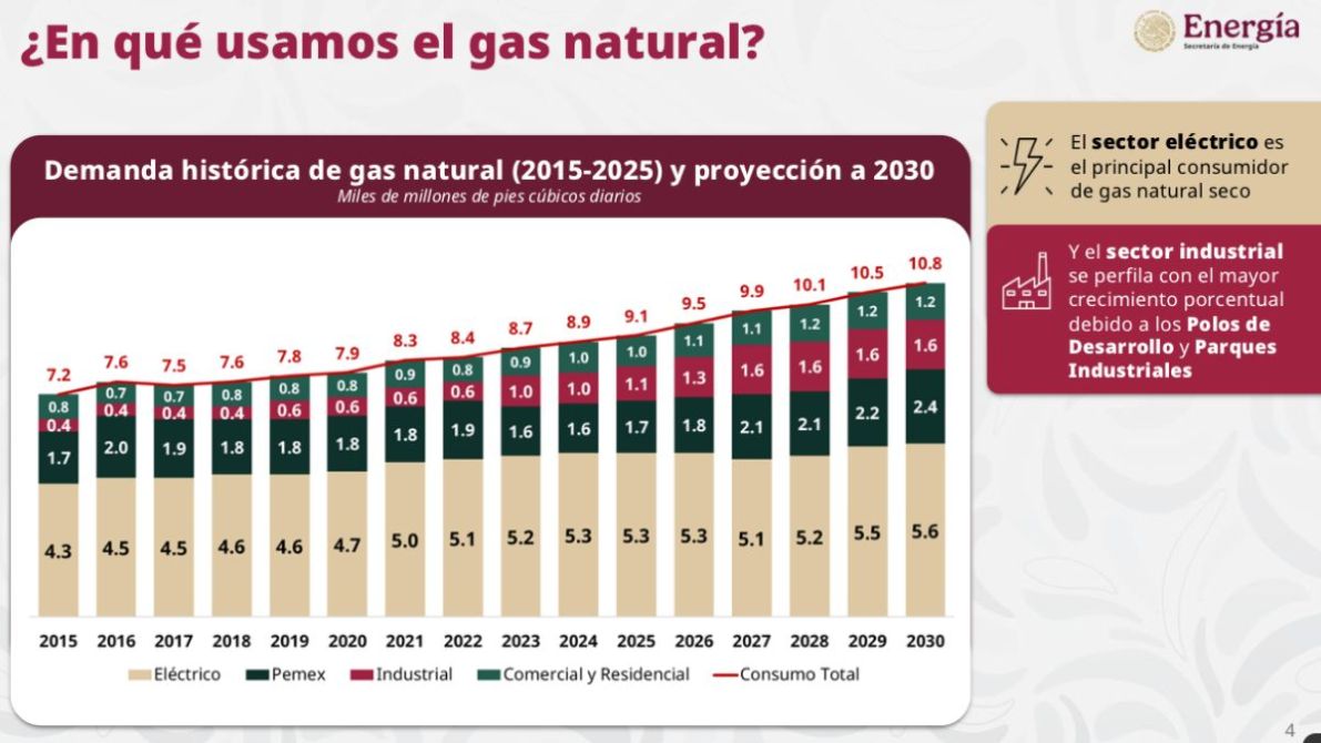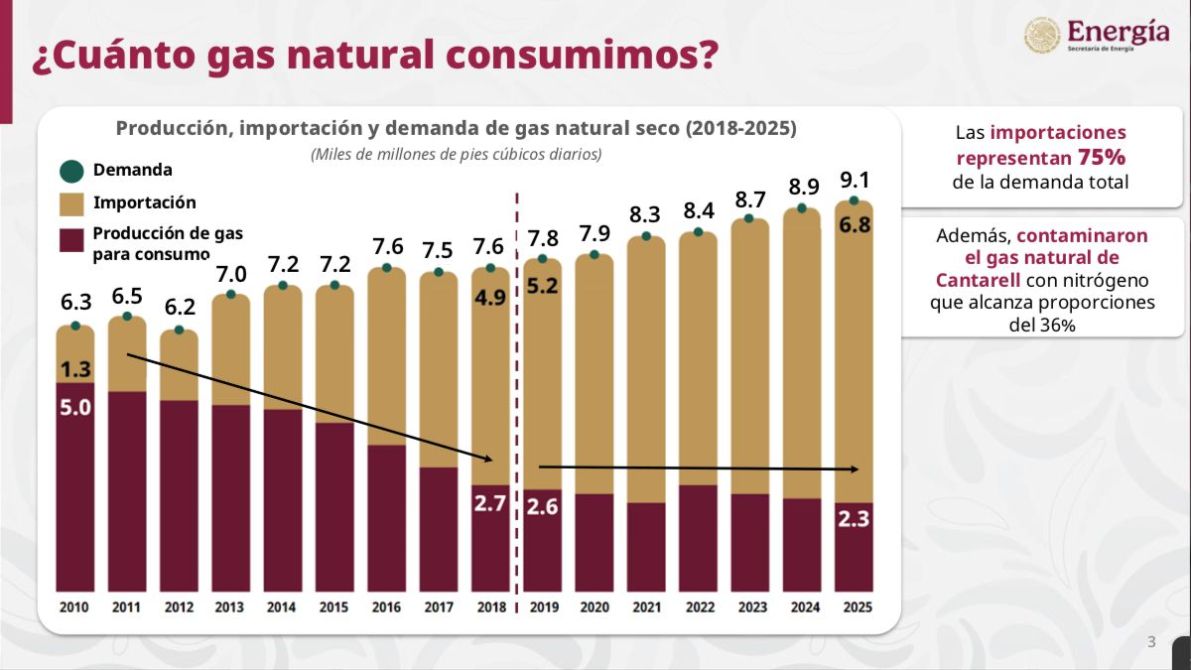Actualmente, México consume cerca de 9 mil millones de pies cúbicos diarios de gas natural, de los cuales solo 2 mil 300 millones son producidos por Petróleos Mexicanos, mientras que 6 mil 800 millones provienen del extranjero, lo que representa una dependencia del 75 por ciento. La mayor parte del gas importado llega desde Estados Unidos, principalmente desde Texas.