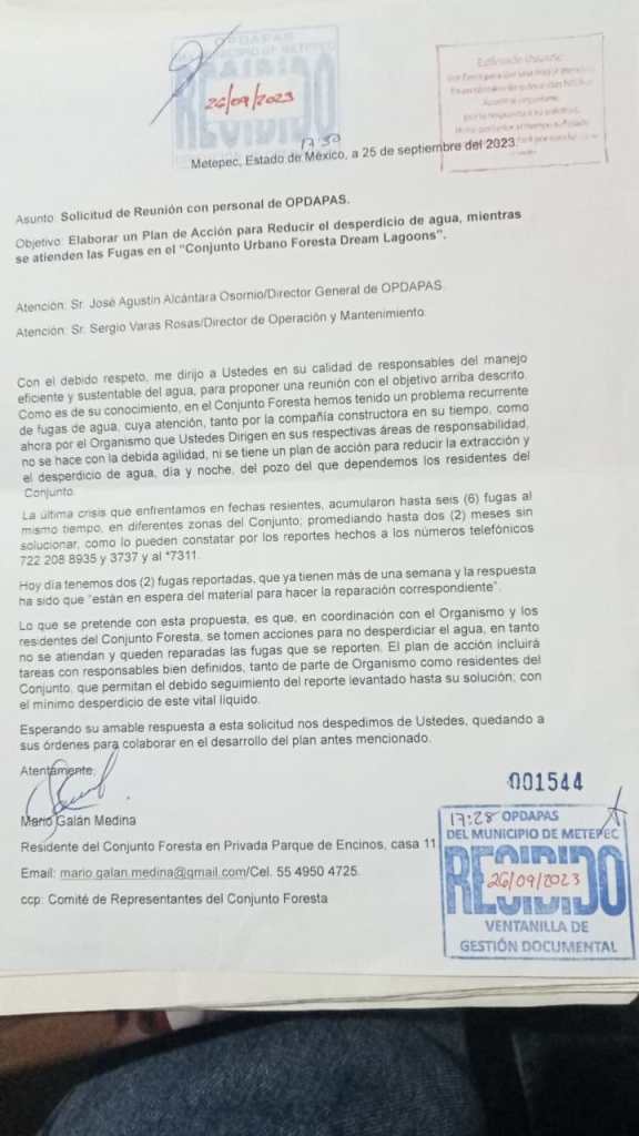 El vecino indicó que la última respuesta de OPDAPAS fue que no disponían de material para arreglar las fugas de agua del pozo. En consecuencia, se le solicitó al Ayuntamiento de Metepec un plan de acción para racionalizar el agua o cerrar válvulas para evitar las fugas mientras se atendía el problema. Sin embargo, destacó que tampoco han obtenido respuesta.