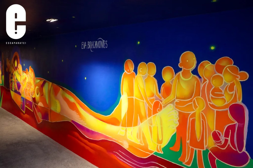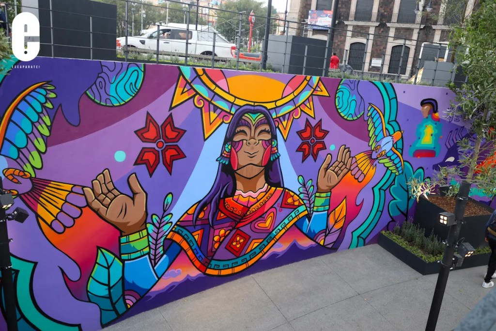 El corredor que nos dirige hacia a la galería artística de la Plaza González Arratia, en Toluca, está ambientado con una obra hecha por los Metzican, ilustradores y artistas urbanos que han recorrido el mundo para dejar su huella en diferentes murales con sus llamativas ilustraciones.