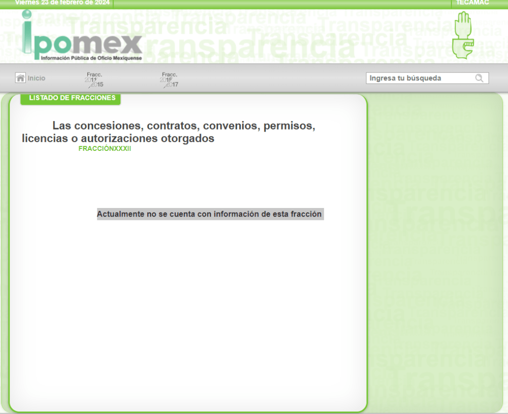 Tampoco es público, ningún contrato de adquisición o servicios, convenio, licencia o permiso de construcción; pese a que la Ley de Transparencia y Acceso a la Información Pública (LTAIPEMM) establece que es obligatorio transparentar dichos documentos.