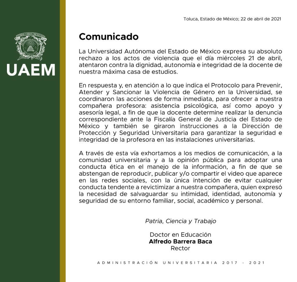 Por la tarde el rector de la máxima casa de estudios Alfredo Barrera Baca emitió un comunicado al respecto en el que se reiteró el apoyo de la institución a la docente y se exhortó a los medios de comunicación y a la opinión pública a tener una conducta ética con el manejo de la información, evitando compartir el video donde la docente es agredida.