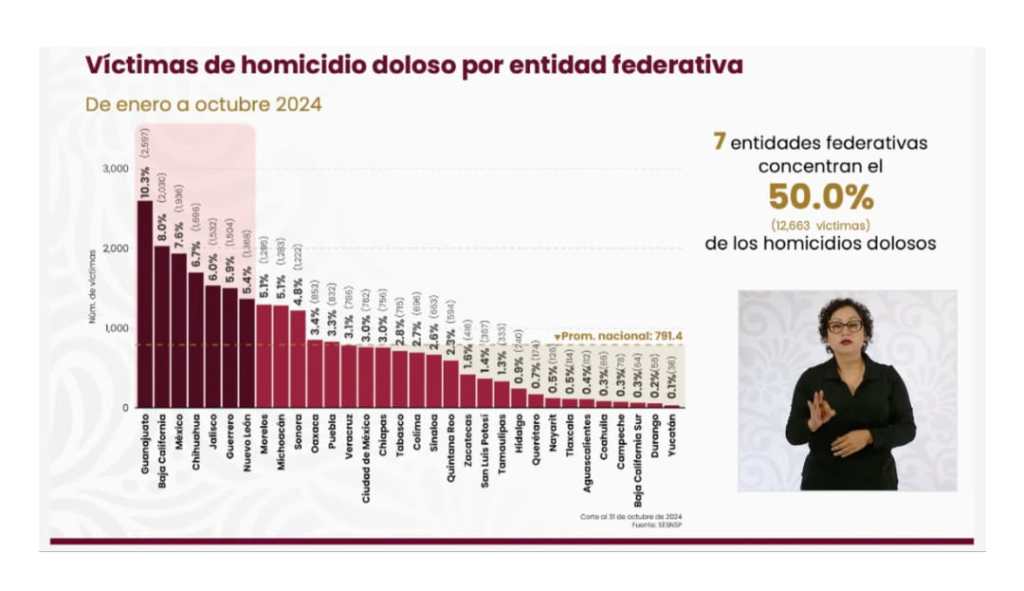 En el ámbito nacional, la presidenta Claudia Sheinbaum Pardo anunció una reducción general del 15% en homicidios dolosos en 2024 respecto al año anterior. Estos avances son atribuidos a la consolidación de estrategias de seguridad impulsadas desde el inicio de su administración, con énfasis en la colaboración entre estados y la federación.
