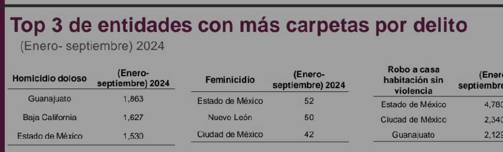 Por su parte, el Consejo Ciudadano para la Seguridad y Justicia, reportó que de enero a septiembre de este año, el Estado de México registró mil 530 carpetas de investigación por homicidio doloso, en primer lugar está Guanajuato con mil 863 y Baja California con mil 627 ocupa el segundo lugar a nivel nacional, según lo reportado por este organismo.