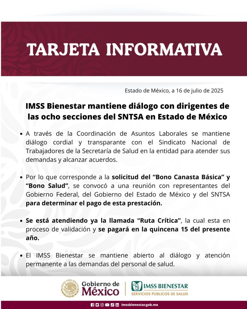 Hasta ahora, solo el Órgano Interno de Control del IMSS ha emitido un pronunciamiento, pero sin compromisos claros. El IMSS-Bienestar informó mediante una tarjeta informativa que mantiene diálogo con las ocho secciones sindicales del SNTSA en el Estado de México. No obstante, los trabajadores consideran que la interlocución ha sido insuficiente.