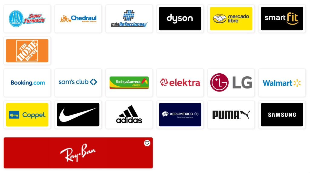 Nike, Adidas, Coppel, Elektra, Costco, Aurrera, Walmart, Liverpool, Suburbia y Aeroméxico.