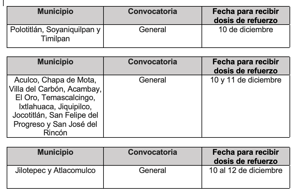 Finalmente informaron que en los próximos días se darán a conocer los municipios, sedes y fechas en donde se continuará la aplicación de la vacuna de refuerzo para adultos mayores de 60 años en el Estado de México, por lo que recomendaron a la población estar pendientes de los canales de comunicación oficiales en donde se difundirán dichos anuncios.
