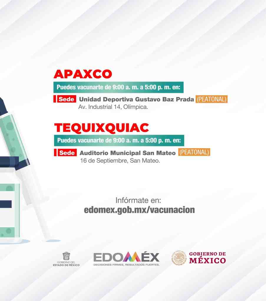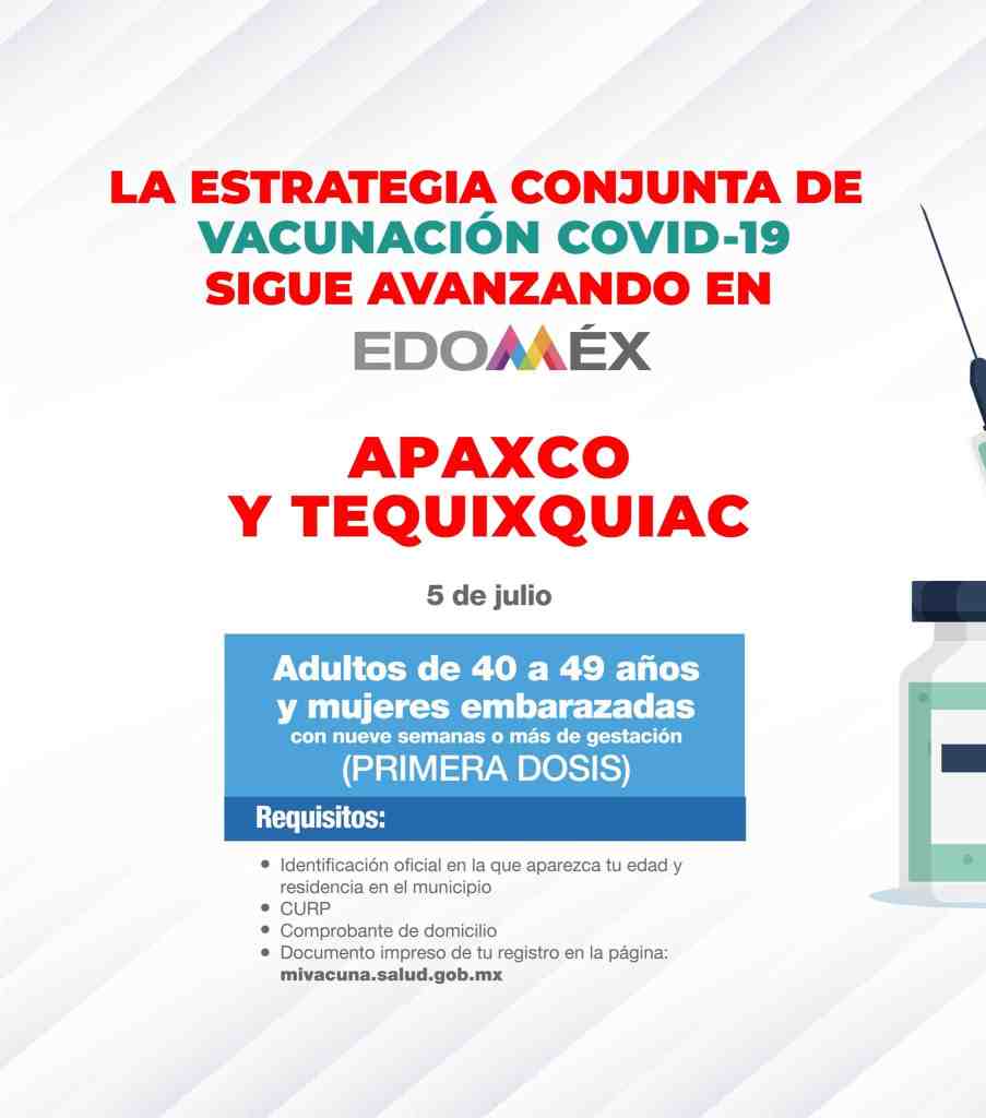 El día de mañana 5 de julio se aplicará la primera dosis a los adultos de 40 a 49 años y mujeres embarazadas en Apaxco y Tequixquiac.