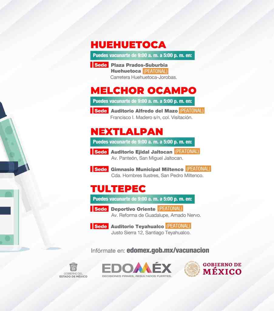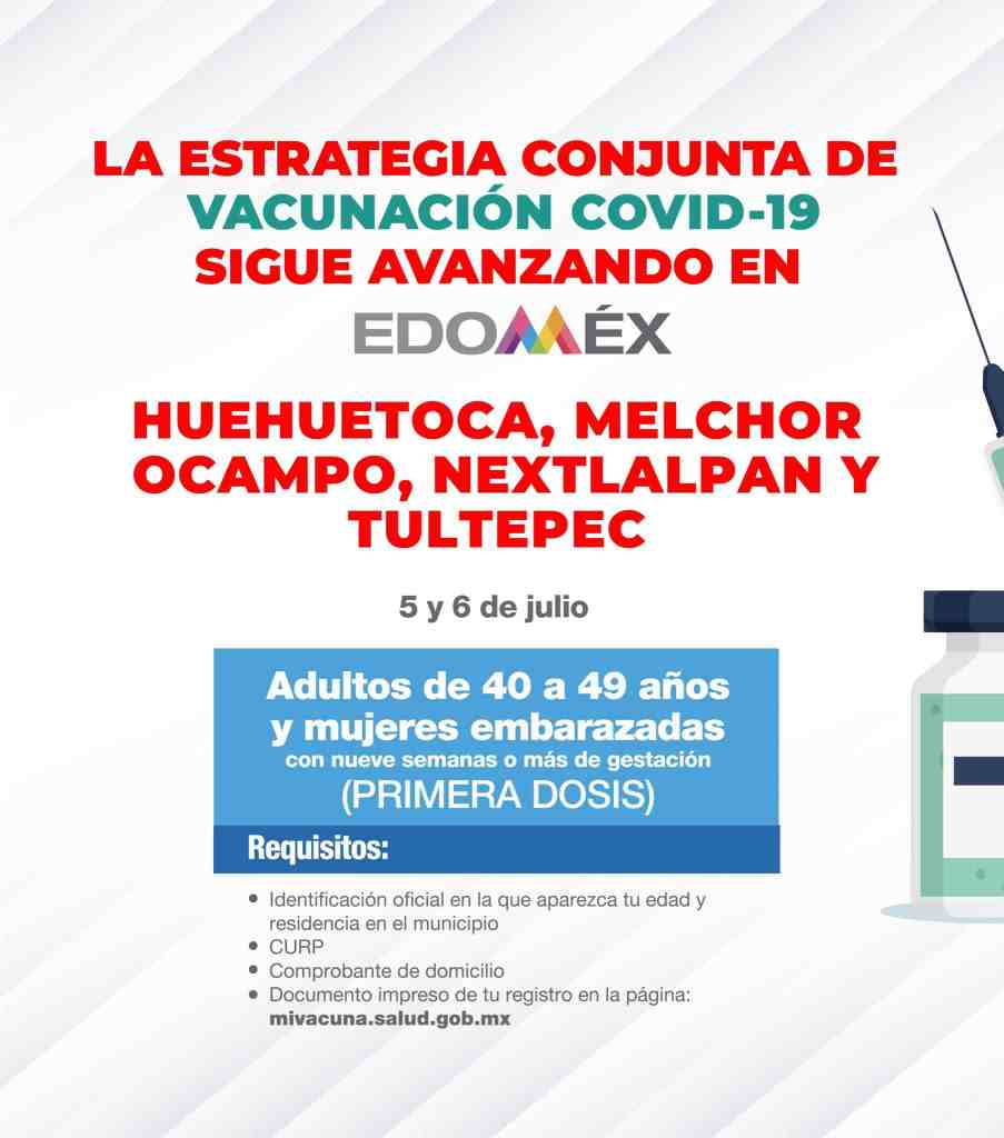 El 5 y 6 de julio se aplicará la primera dosis a los adultos de 40 a 49 años y mujeres embarazadas en Huehuetoca, Melchor Ocampo, Nextlalpan y Tultepec.