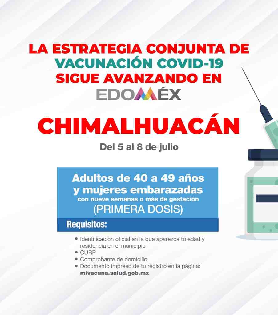 Del 5 al 8 de julio se aplicará la primera dosis a los adultos de 40 a 49 años y mujeres embarazadas en Chimalhuacán.