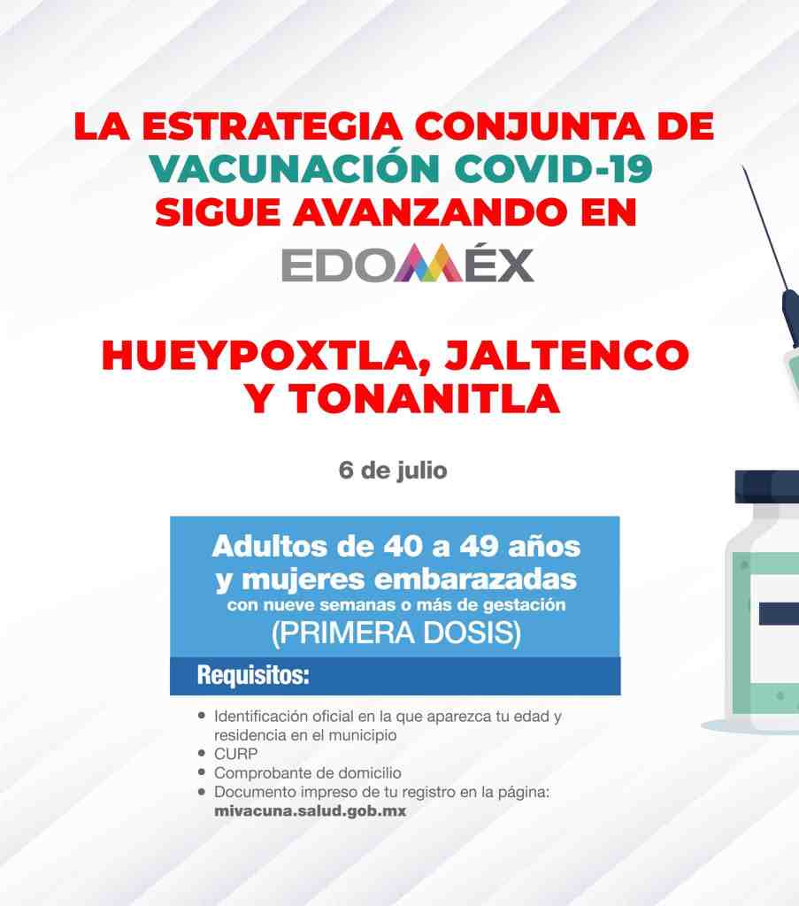El 6 de julio se aplicará la primera dosis a los adultos de 40 a 49 años y mujeres embarazadas en Hueypoxtla, Jaltenco y Tonanitla.