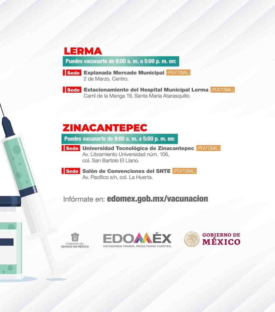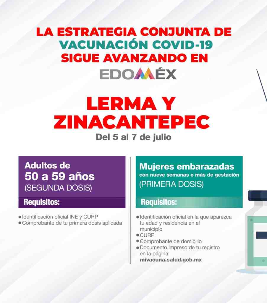 Del 5 al 7 de julio se aplicará la segunda dosis a los adultos de 50 a 59 años y la primera dosis a mujeres embarazadas en Lerma y Zinacantepec.