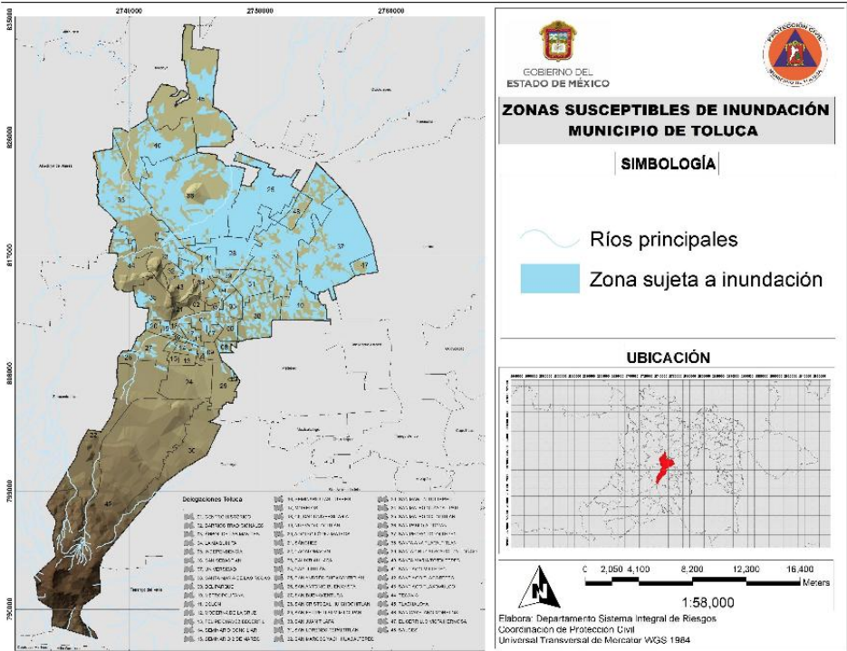 De acuerdo con la última actualización del Atlas de Riesgos de Toluca, de fecha 2 de mayo de 2023, son siete las zonas de inundación en el municipio, ubicadas en las delegaciones de San Pedro Totoltepec, San Andrés Cuexcontitlán, Santa Ana Tlapaltitlán, Santiago Tlaxomulco y San Juan Tilapa.