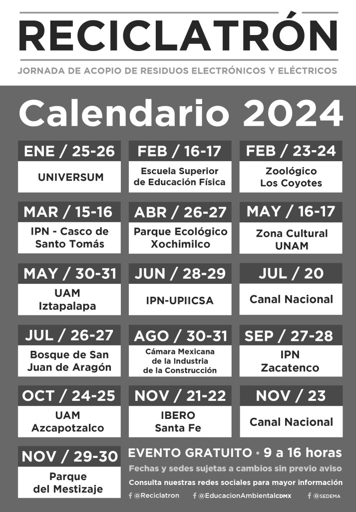 La Secretaría del Medio Ambiente (Sedema) de la Ciudad de México te invita a sumarte al Reciclatrón, una iniciativa para recoger residuos electrónicos y eléctricos. Las sedes cambian cada mes, pero este 26 al 27 de abril del 2024 la cita es en el Parque Ecológico Xochimilco, de 9 a 16 horas.