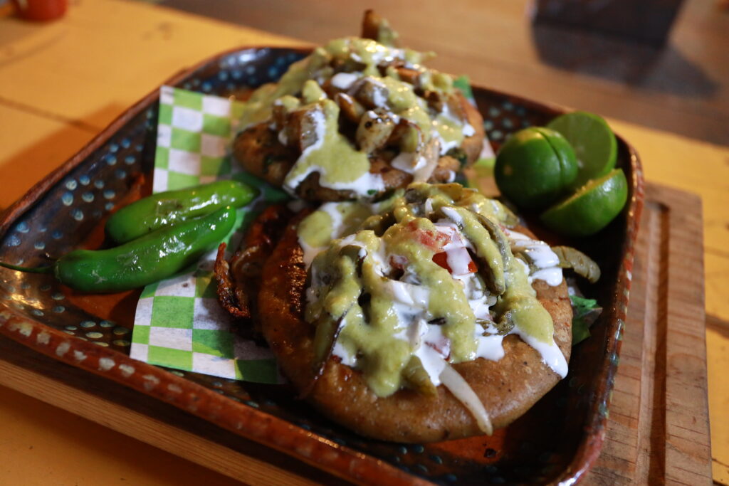 La orden va a acompañada con una guarnición de papas o nopales, crema y una salsa, ¡y una salsa! De esas que no puedes dejar de comer.