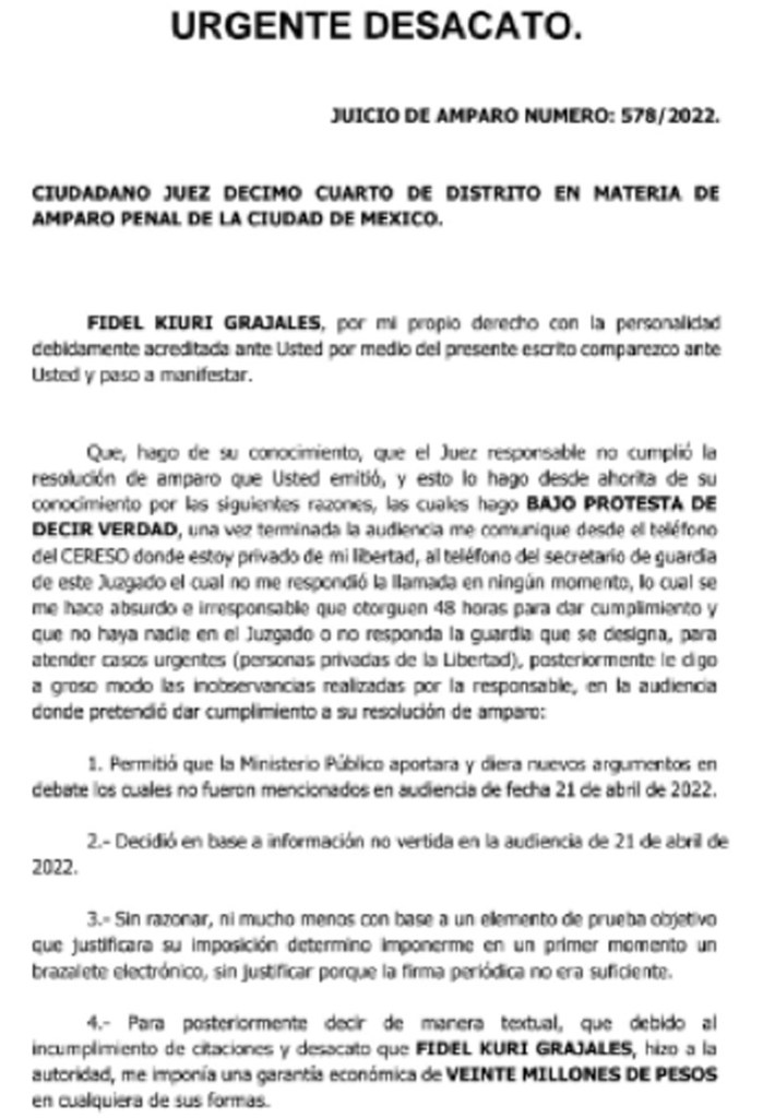 Este hecho fue considerado un gran paso, según anunció el abogado de Kuri Grajales, en redes sociales. Pero lo cierto es que en realidad esperaban que se le hubiera otorgado la libertad sin necesidad de fianza y menos brazalete. Por ello, hace unas semanas presentaron una denuncia ante el juez federal, acusando de desacato y violación a la sentencia de amparo.