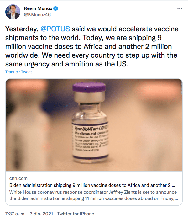 Este viernes, Estados Unidos envió 9 millones de dosis de vacunas contra covid-19 a países del continente africano, así como 2 millones de dosis a otras naciones, informó el portavoz de la Casa Blanca, Kevin Muñoz.