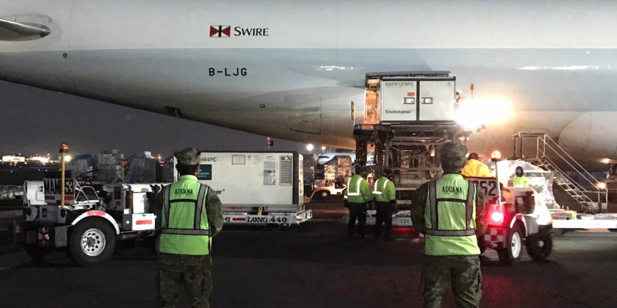 Alrededor de las 6:00 horas llegó a la Terminal 1 del Aeropuerto Internacional de la Ciudad México, en el vuelo CX86 Cathay Pacific el lote de Sinovac.