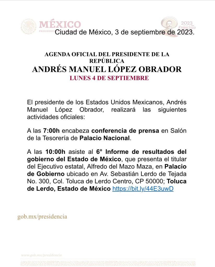 La oficina de la Presidencia informó que después de la conferencia matutina en Palacio Nacional, el mandatario federal se dirigirá a la ciudad de Toluca para acompañar a Del Mazo a su último mensaje.