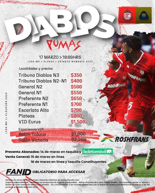 Precios y localidades: Tribuna Diablos N3 $350, N2-N1 $400, General N2 $500, N1 $550, Preferente N2 $650, Preferente N1 $700, Escarlata Alta $700, Plateas $800, VID Eurus $1,500. Por su parte, la Experiencia VIP en Salón Toluca $1,800 y Salón Victoria $2,200.