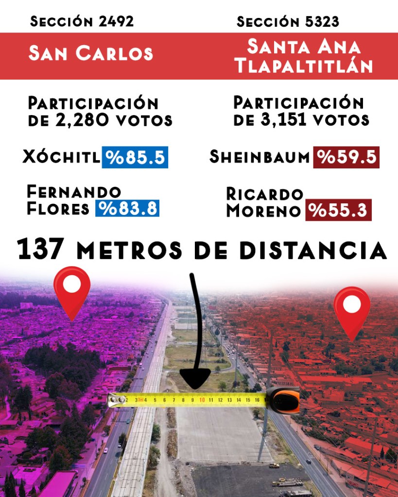 Solo cruzando una calle, en la colonia popular Santa Ana Tlapaltitlán, ya en el municipio de Toluca, la situación es opuesta. Ahí, Claudia Sheinbaum obtuvo el 61%, Xóchitl el 24% y Jorge Máynez el 11%.