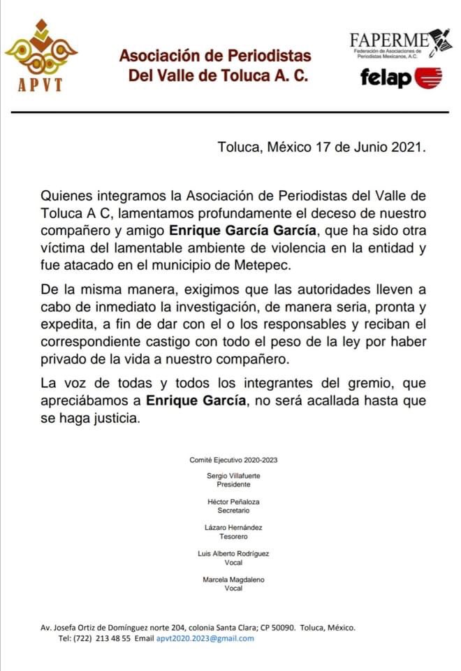 A través de un comunicado, la Asociación de Periodistas del Valle de Toluca (APVT) lamentó el asesinato de su colega y pidió a las autoridades correspondientes dar con los responsables y hacerle justicia.