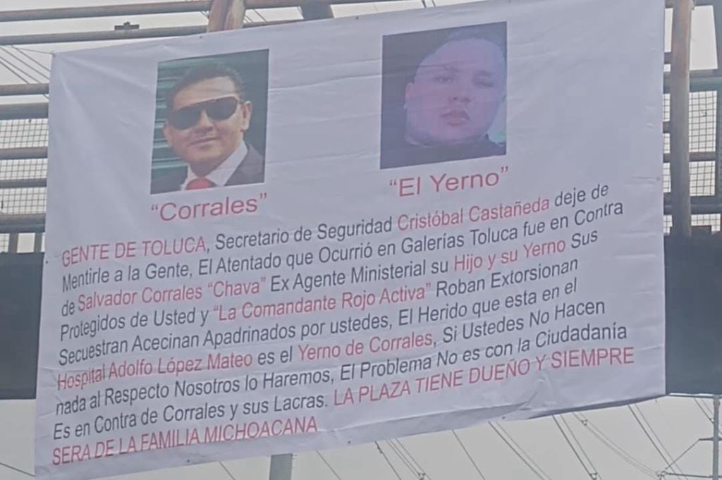 El mensaje decía “Gente de Toluca, secretario de Seguridad, Cristóbal Castañeda, deje de mentirle a la gente. El atentado que ocurrió en Galerías, Toluca fue en contra de Salvador Corrales “chava” exagente ministerial, su hijo y su yerno, sus protegidos, usted y la comandante rojo activa. Roban, extorsionan, secuestran, asesinan apadrinados por ustedes. El herido que está en el hospital Adolfo López Mateos es el yerno de Corrales y si usted no hace nada al respecto nosotros lo haremos. El problema no es contra la ciudadanía, es contra de Corrales y sus lacras. La plaza tiene dueño y siempre será de la Familia Michoacana.”
