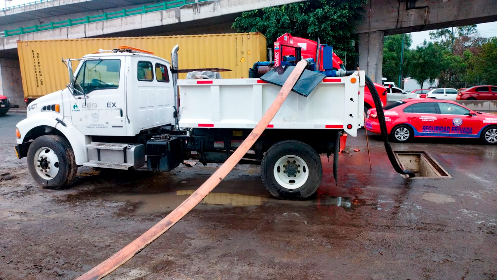 Adicionalmente, en la Colonia Ampliación Vicente Villada en Nezahualcóyotl, el Grupo Tláloc suprimió los encharcamientos con el apoyo de un equipo hidroneumático y un camión tipo cisterna.