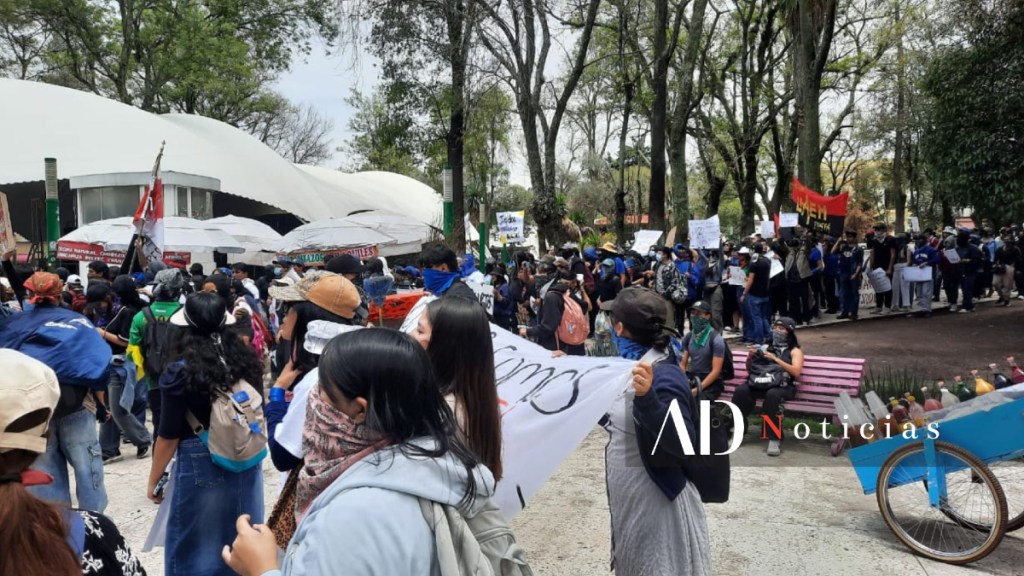 Estudiantes de la UAEMéx continúan su movilización por el centro de la ciudad y actualmente se encuentran en Los Portales de Toluca. La manifestación avanza de forma pacífica.