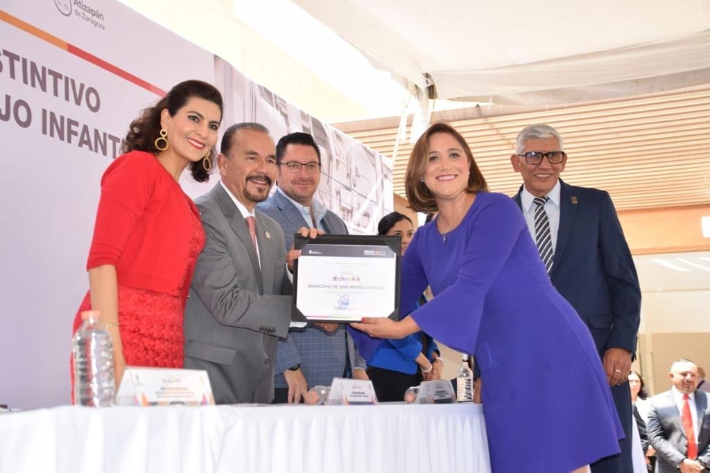 La presidenta municipal de San Mateo Atenco, Ana Muñiz Neyra, recibió de la secretaria del Trabajo del Estado de México, Maribel Góngora Espinosa, el Distintivo EDOMEXTI, que reconoce las buenas prácticas de la administración municipal contra el trabajo infantil.