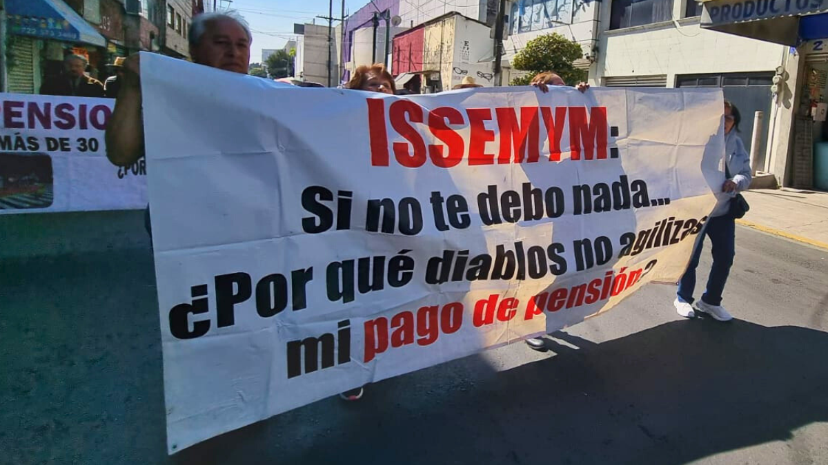 Maestros, pensionados, estudiantes y sindicalizados marcharon este miércoles en el Centro Histórico de Toluca para exigir el pago de pensiones atrasadas y el abastecimiento de medicamentos en el Instituto de Seguridad Social del Estado de México y Municipios (Issemym).