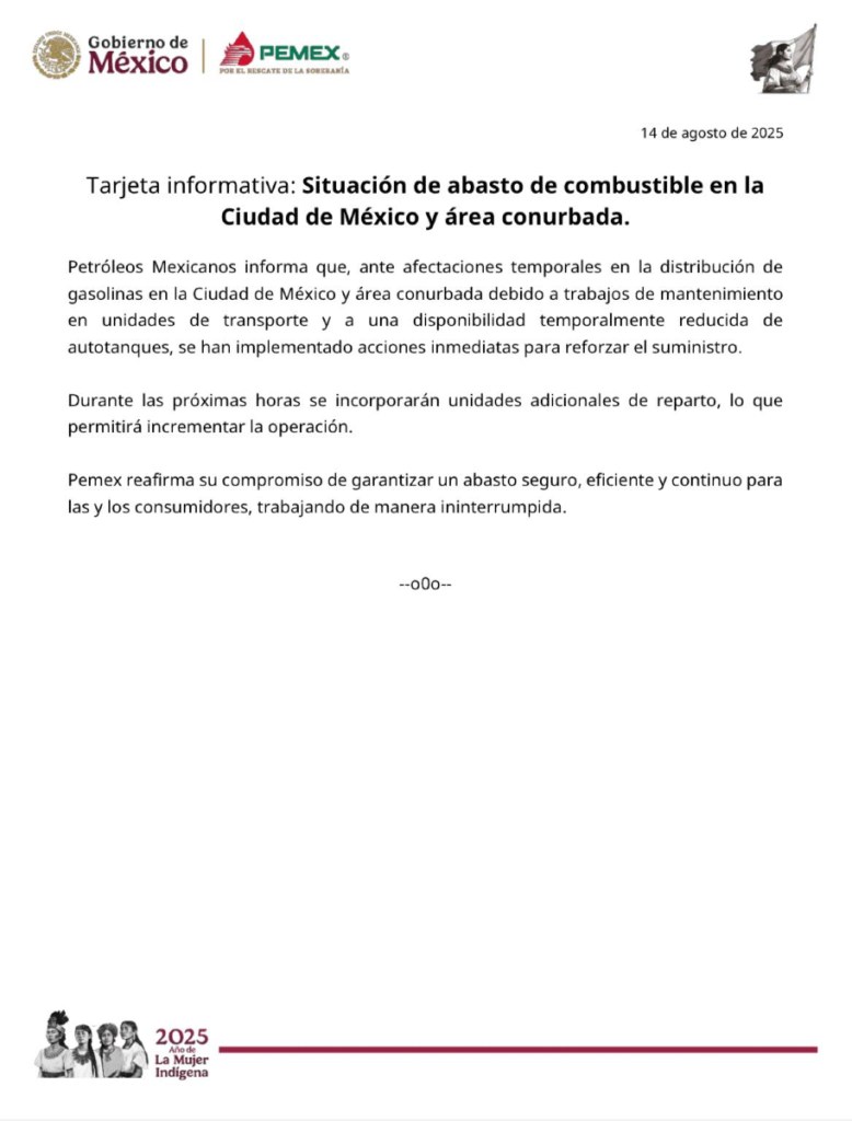 El 14 de agosto, Petróleos Mexicanos (PEMEX) informó que las afectaciones temporales en la distribución de combustible en la Ciudad de México y su área metropolitana se deben a trabajos de mantenimiento en unidades de transporte y a la menor disponibilidad de autotanques.