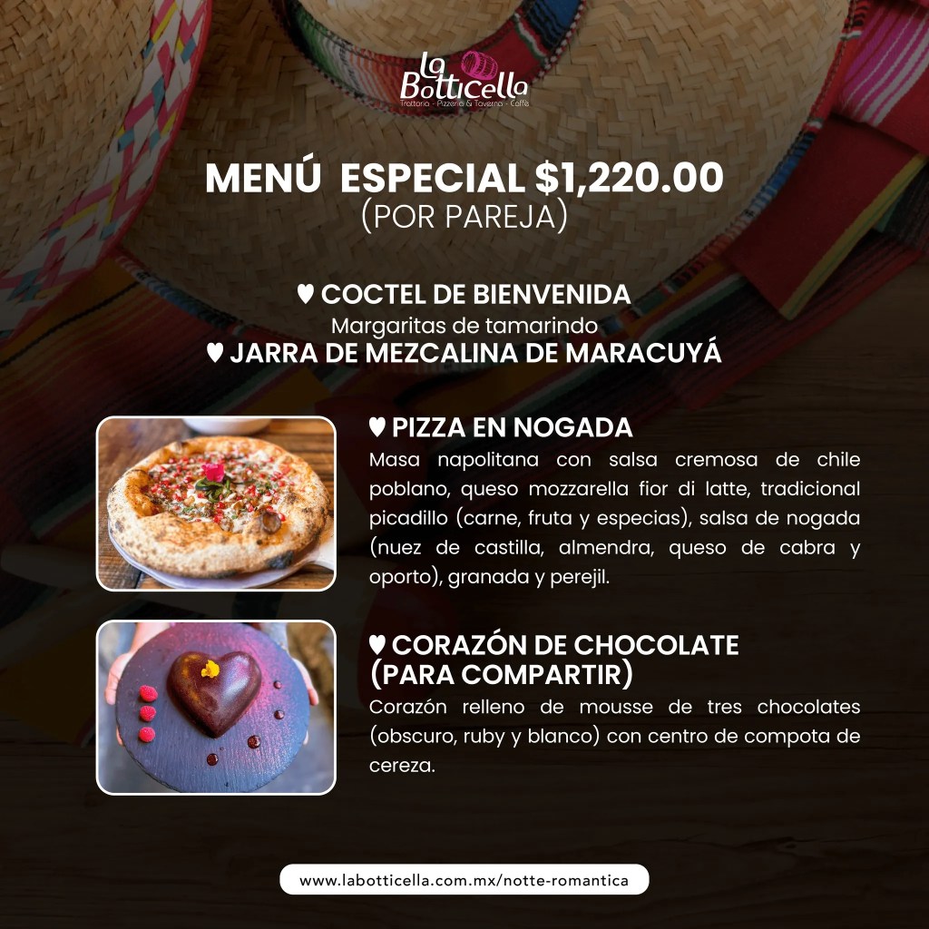 Los platillos a degustar son pizza de nogada, una jarra de mezcalina de maracuyá, margaritas de tamarindo y un postre de tres chocolates con cereza.