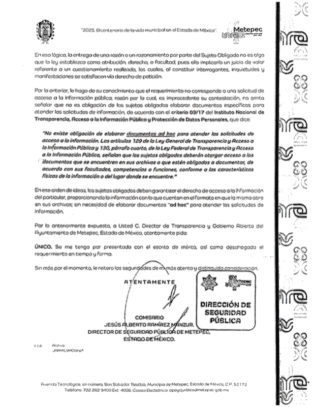 Sin embargo, esa afirmación contradice lo que establecen la Ley de Transparencia y Acceso a la Información Pública del Estado de México y Municipios y el Reglamento de Transparencia de Metepec.