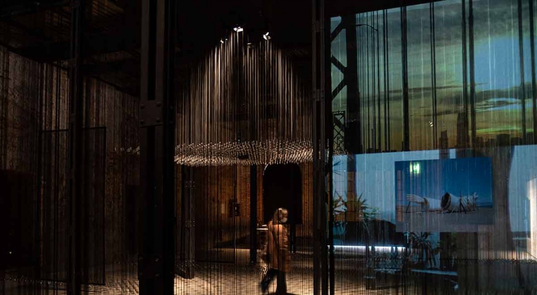 Dedicada a los «Desplazamientos», el pabellón de México en los espacios del Arsenal, de 45 metros cuadrados, invita a recorrer a oscuras, en solitario, caminos desconocidos creados con 5.000 hilos de plomo durante el cual se escuchan voces, lluvia, insectos, y se entrevén imágenes.