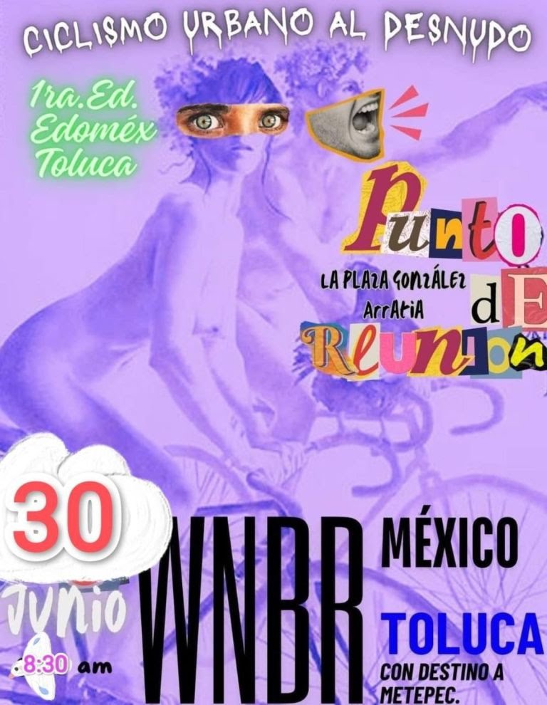 La cita para ser parte del Movimiento Internacional de la Rodada Mundial Ciclista al Desnudo (WNBR, por sus siglas en inglés), se llevará a cabo el 30 de junio y por primera vez participarán los municipios de Toluca y Metepec, del Estado de México (Edomex).